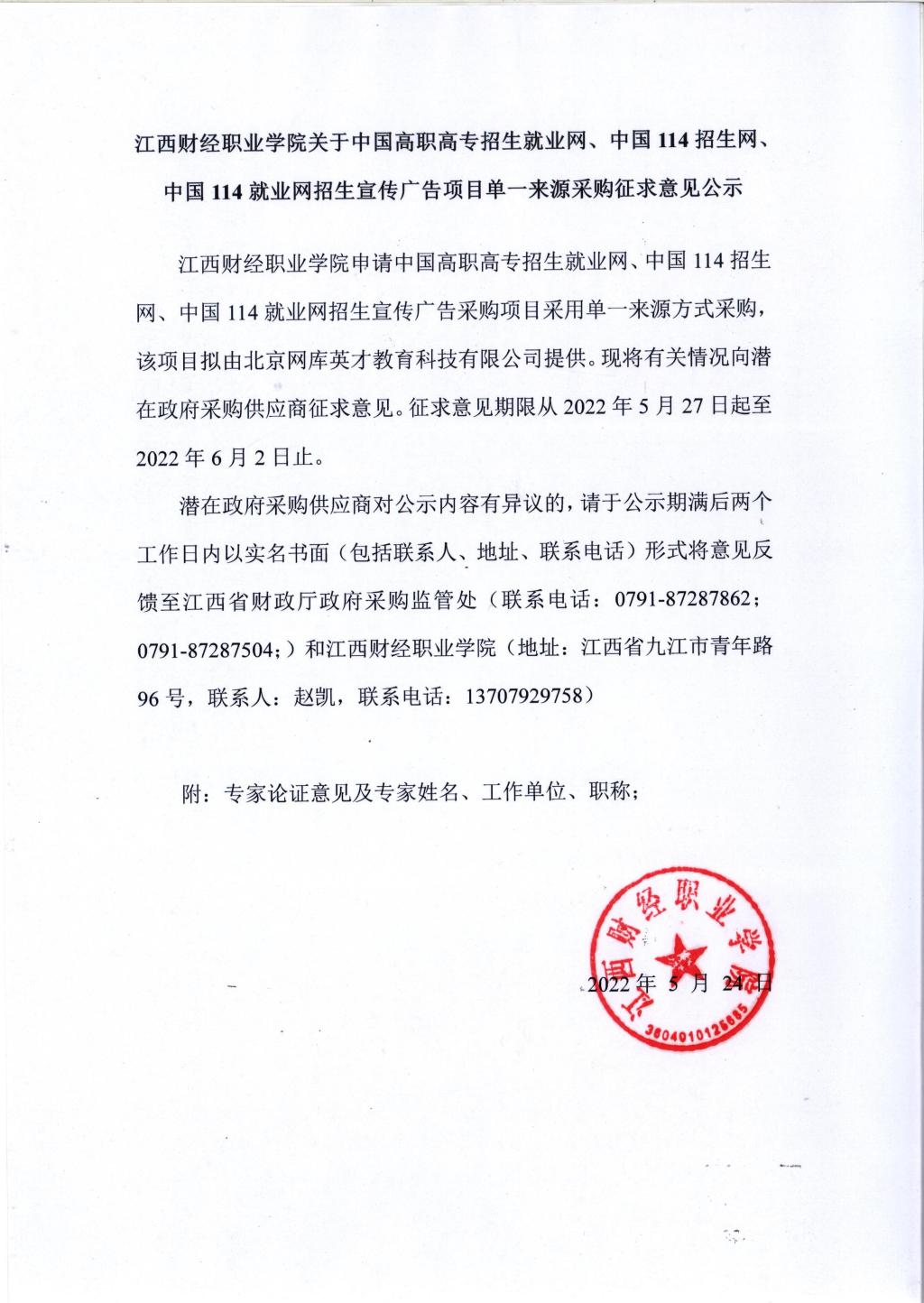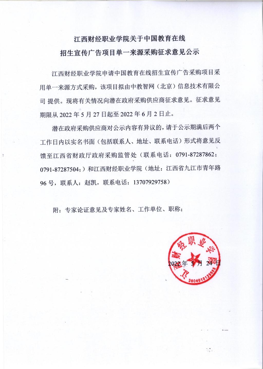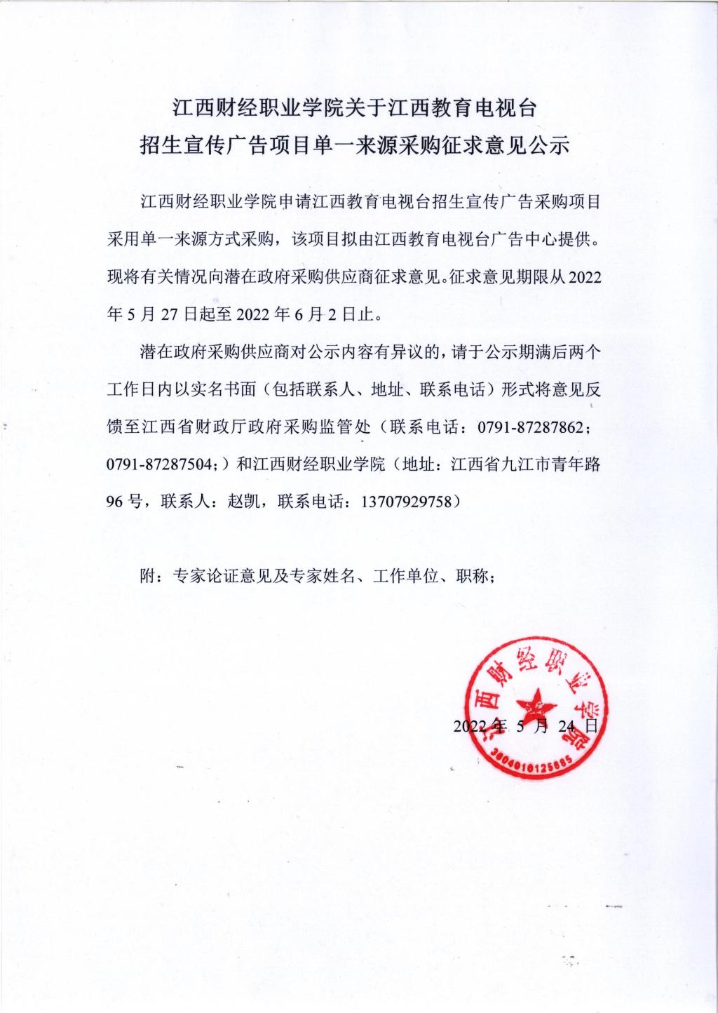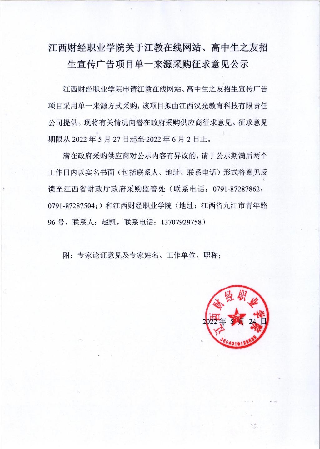 江西財經職業學院關于招生宣傳廣告項目單一來源采購征求意見公示