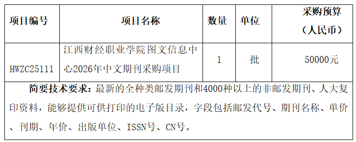 1.項目名稱:江西財經職業學院圖文信息中心2026年中文期刊采購項目