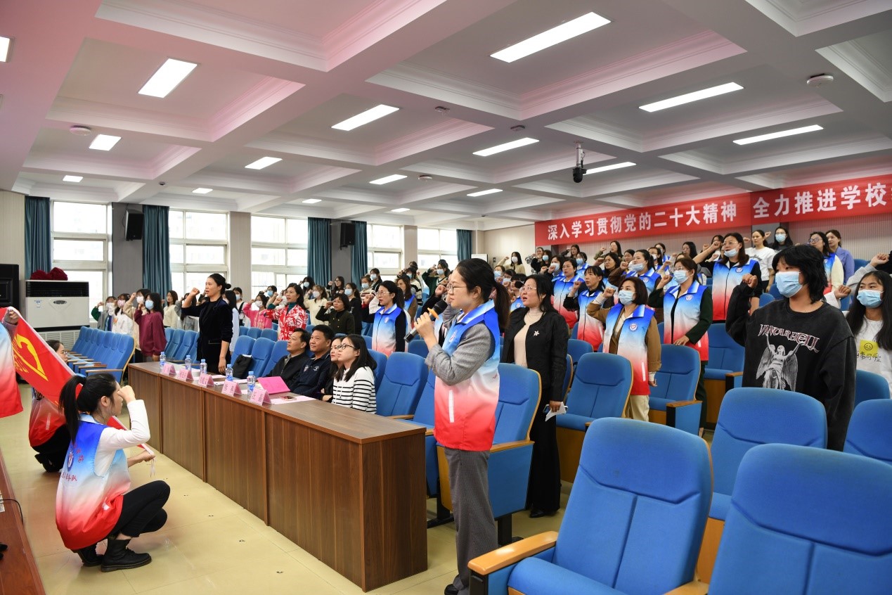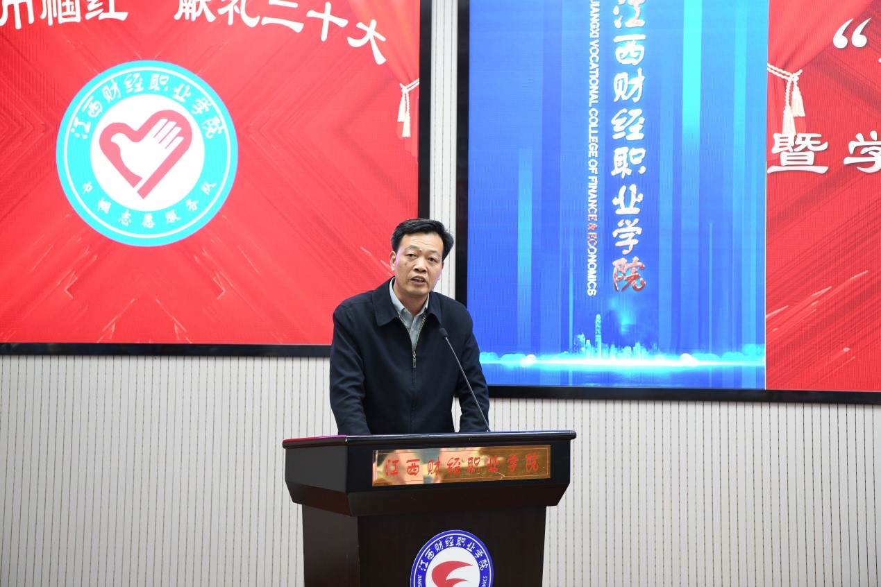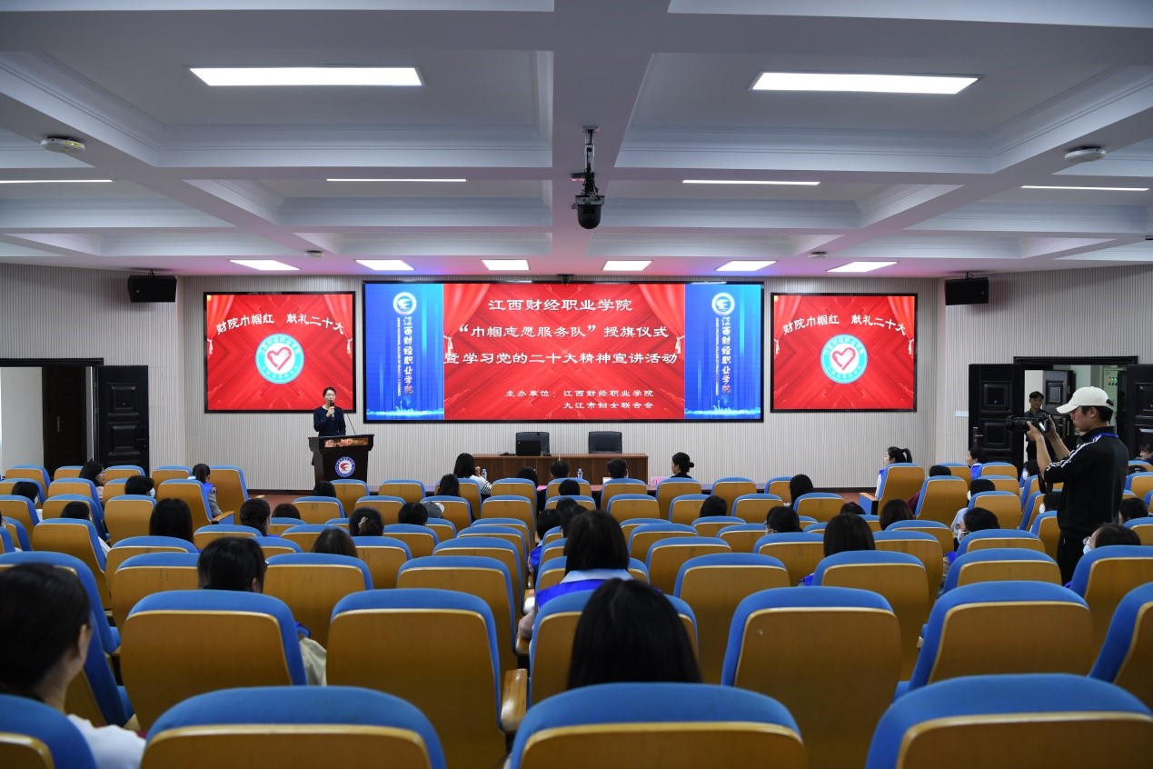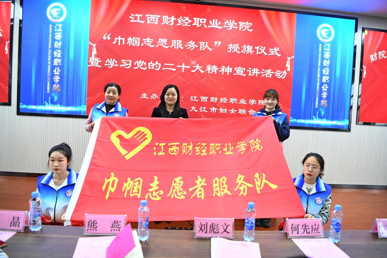 為學習宣傳貫徹黨的二十大精神,充分發掘我校女教職工的志愿服務潛力,大力弘揚“無私奉獻、傳遞愛心、互助友愛、健康向上”的志愿精神,校工會聯合九江市婦聯于11月3日在七樓報告廳舉辦了江西財經職業學院“巾幗志愿服務隊”授旗儀式暨學習黨的二十大精神宣講活動。