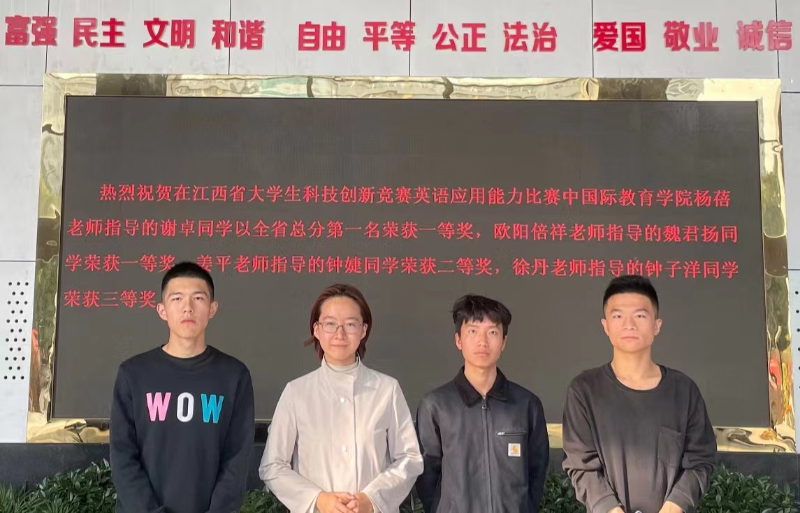 2022年11月6日,由江西省教育廳主辦,江西科技師范大學、北京燕興國際教育承辦,江西省外語學會協辦的江西省大學生科技創新競賽英語應用能力賽項的決賽順利完賽。我校國際教育學院楊蓓、歐陽倍祥、姜平、徐丹四位老師指導的商務英語專業謝卓、魏君揚、鐘婕、鐘子洋4位選手榮獲一等獎2項,二等獎1項,三等獎1項,其中謝卓同學奪得全省專科組總分第一名,楊蓓、歐陽倍祥兩位老師獲得“優秀指導教師”稱號。我校是專科組中獲獎選手人數最多、成績最好的院校。