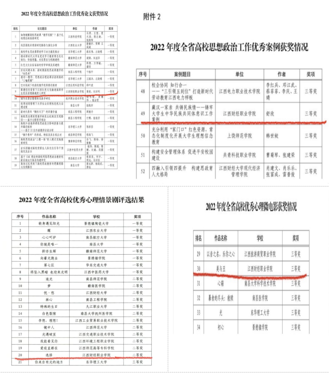 黃亮、劉洋利老師的《職教創優背景下江西紅色文化融通高職學生黨員培根鑄魂育人研究》榮獲2022年度全省高校思想政治工作優秀論文一等獎;舒欣老師的《藏漢一家親 共鑄民族情——鑄牢大學生中華民族共同體意識工作案例》榮獲2022年度全省高校思想政治工作優秀案例三等獎;大學生心理健康教育中心選送的作品《選擇》榮獲2022年度全省高校優秀心理情景劇二等獎,作品《美與丑》榮獲優秀心理微電影三等獎。