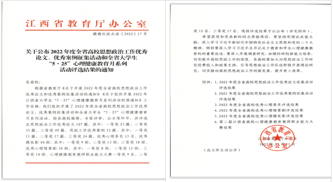 近日,江西省教育廳印發了《關于公布2022年度全省高校思想政治工作優秀論文、優秀案例征集活動和全省大學“5·25”心理健康教育月系列活動評選結果的通知》,我校喜獲多項獎勵。
