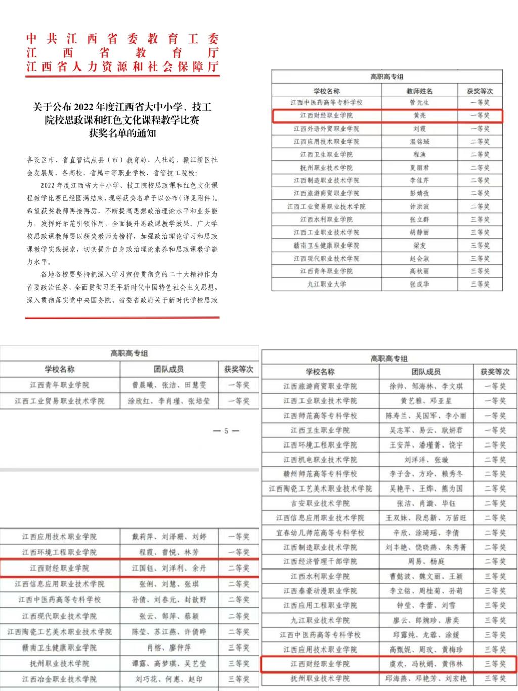 近日,中共江西省委教育工委、江西省教育廳、江西省人力資源和社會保障廳公布了2022年度江西省大中小學(xué)、技工院校思政課和紅色文化課程教學(xué)比賽獲獎名單,我校教師再獲佳績,黃亮老師獲《紅色文化十講》一等獎,江國鈺、劉洋利、余丹團(tuán)隊獲“毛澤東思想和中國特色社會主義理論體系概論”課二等獎,虞歡、馮秋娟、黃偉林團(tuán)隊獲“思想道德與法治”課三等獎。