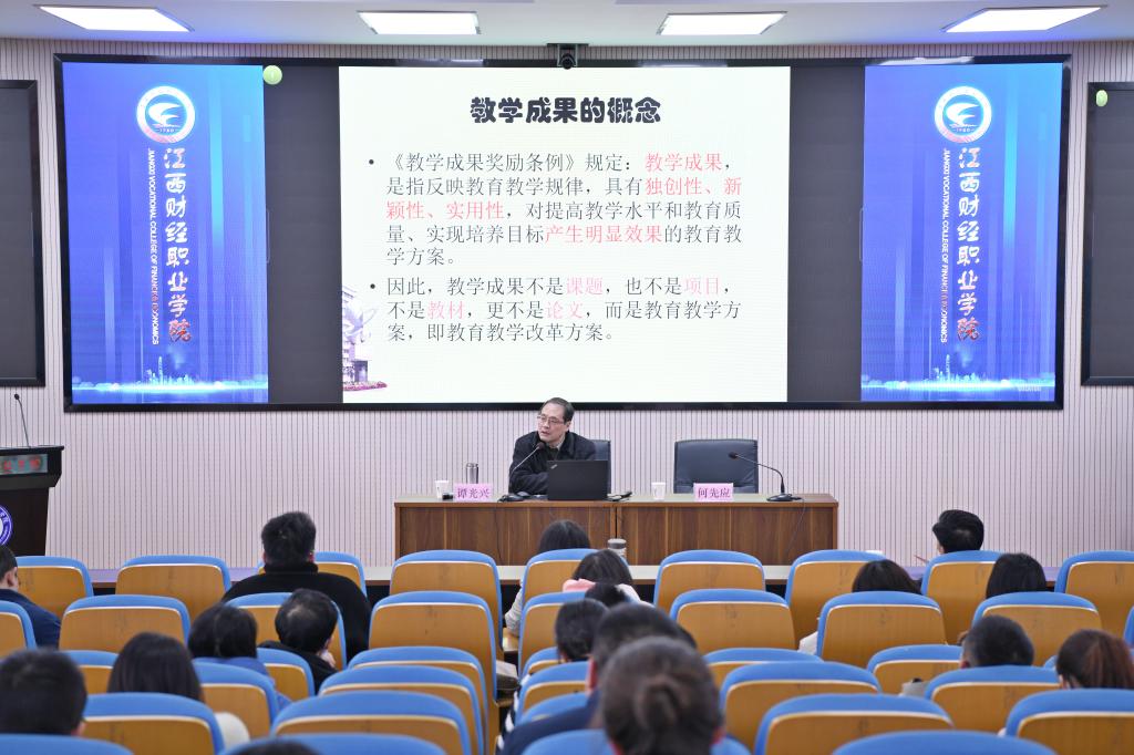 為進(jìn)一步培育、凝練我校優(yōu)秀教學(xué)成果,深化教學(xué)改革,2月22日下午,學(xué)校特邀江西財(cái)經(jīng)大學(xué)資深教授、博士生導(dǎo)師譚光興作了題為《提煉教學(xué)成果 促進(jìn)教學(xué)改革》的專題輔導(dǎo)講座。黨委副書記、校長(zhǎng)彭慧與我校專兼職教師現(xiàn)場(chǎng)聆聽了講座,講座由黨委副書記、常務(wù)副校長(zhǎng)何先應(yīng)主持。