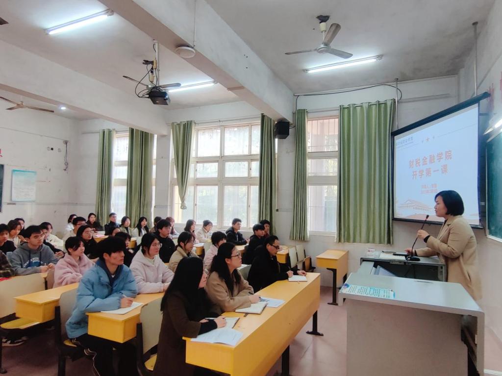 3月3日,校黨委副書記、校長彭慧在教學樓104教室,以“青春向黨,做堪當大任的時代新人”為主題,為財稅金融學院學生講授“開學第一課”。