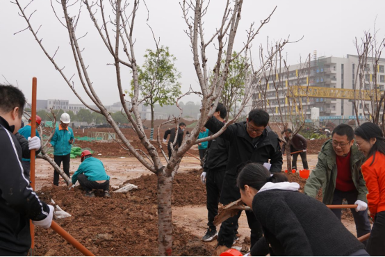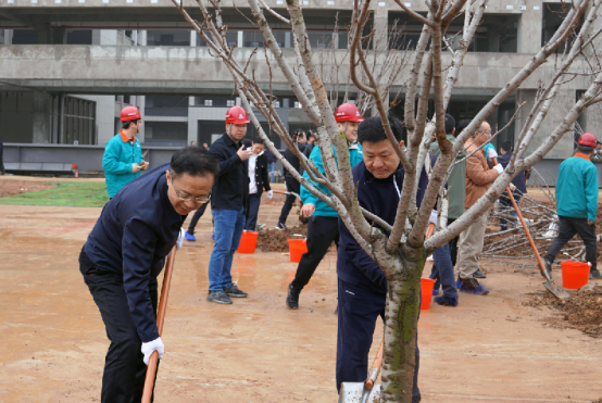 大家早早地來到八里湖新校區(qū),在規(guī)劃好的一片空地上緊張地勞動(dòng)起來。大家拿起勞動(dòng)工具埋頭植樹,有的揮鍬挖坑、有的鏟土填土、有的澆水,大家配合默契,經(jīng)過辛勤的勞動(dòng),多棵櫻花樹“安家落戶”。雖然有些勞累,但同志們都興高采烈,仿佛已經(jīng)看見我們的新校園綠樹成蔭、繁花似錦。