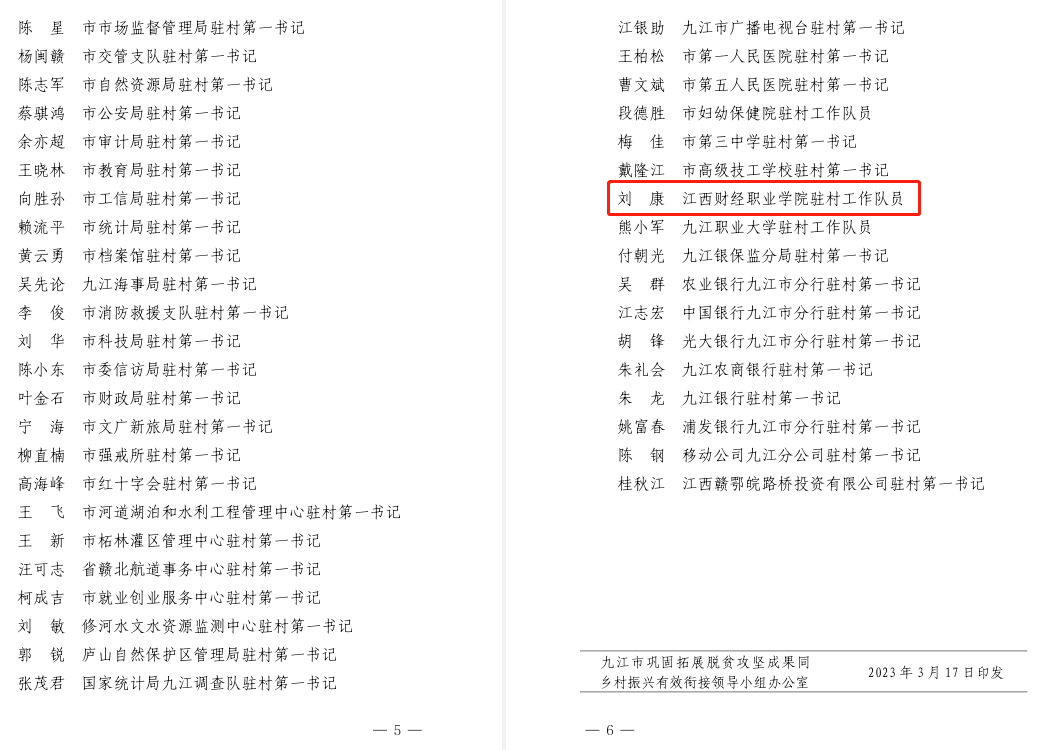 近日,九江市鞏固拓展脫貧攻堅成果同鄉村振興有效銜接領導小組下發《關于2022年度全市定點幫扶工作考核通報》(九鞏銜發〔2023〕3號)文件,對扎實推進定點幫扶工作,在鞏固拓展脫貧攻堅成果,全面推進鄉村振興領域作出突出成績的單位進行表彰。我校在2022年度九江市定點幫扶和駐村工作考核中獲評先進單位,劉康同志榮獲先進個人。