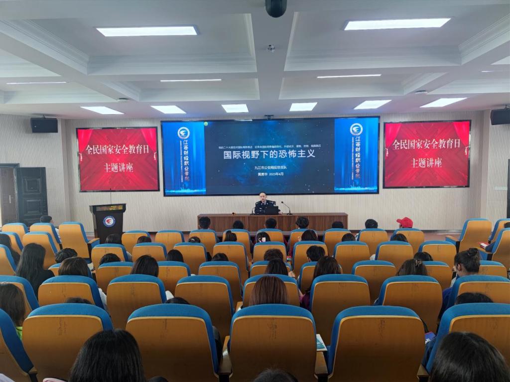 活動一:專題講座。學(xué)校聯(lián)合九江市公安局開展國家安全教育宣傳日主題講座,內(nèi)容涉及《國家安全法》《反恐怖主義法》《反間諜法》等法律法規(guī)和生活中涉及國家安全的公民權(quán)利與義務(wù)的常識,引導(dǎo)師生增強(qiáng)安全意識和法治觀念,自覺守法護(hù)法。