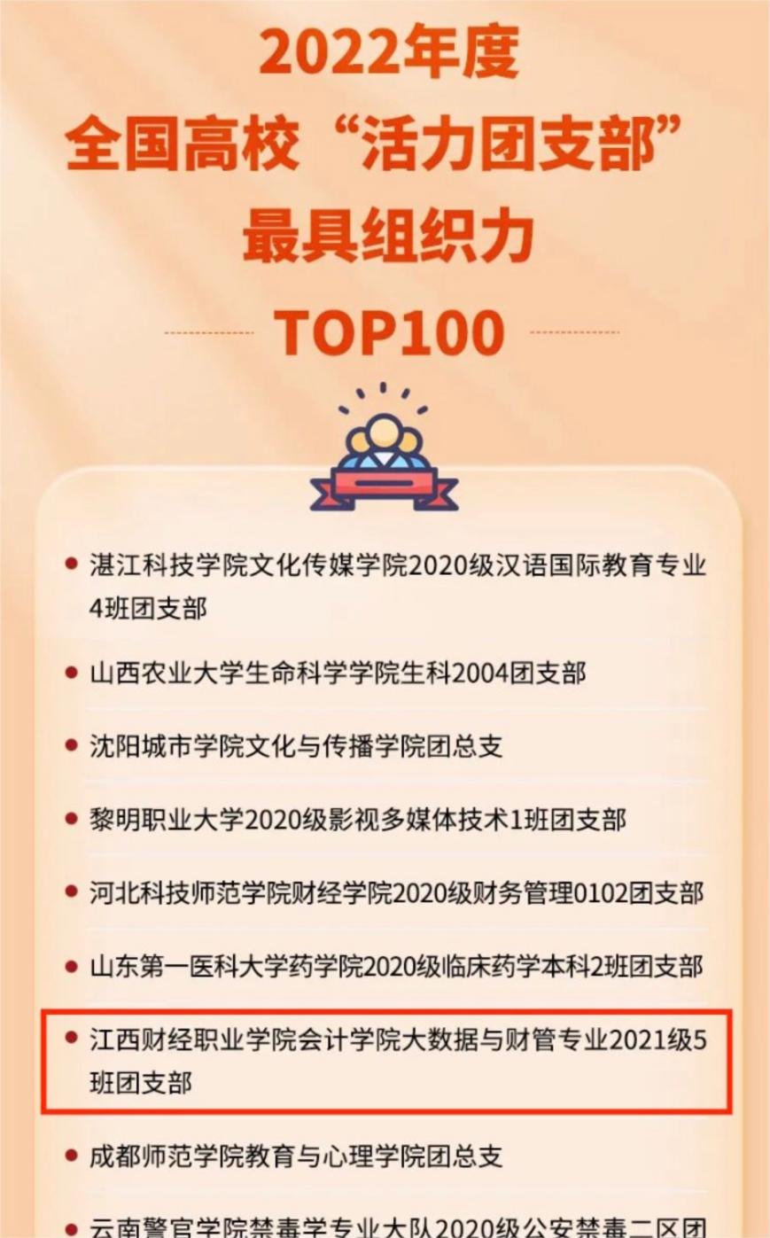 近日,2022年度高校“活力團(tuán)支部”風(fēng)采展示活動(dòng)正式公布評(píng)選結(jié)果,會(huì)計(jì)學(xué)院大數(shù)據(jù)與財(cái)管專(zhuān)業(yè)2021級(jí)5班團(tuán)支部榮登《2022年度全國(guó)高校“活力團(tuán)支部”最具組織力TOP100榜》。