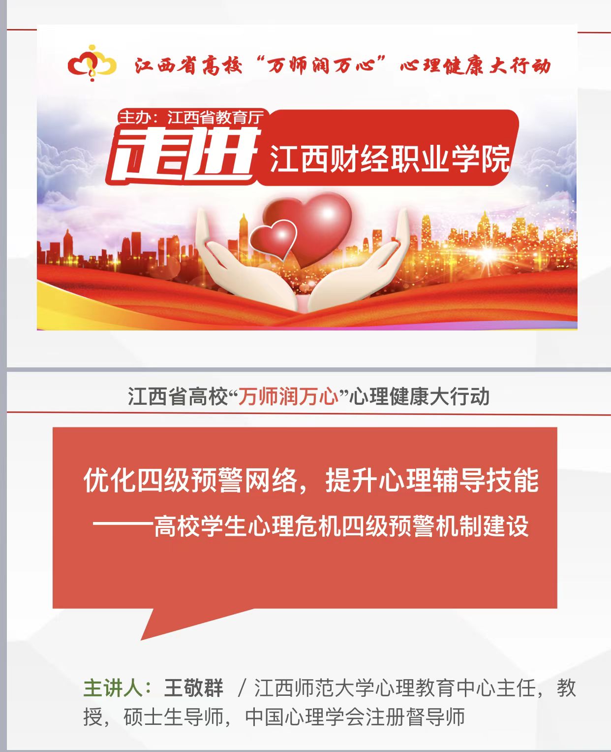 根據(jù)省教育廳《關(guān)于印發(fā)<全省高校“萬師潤萬心”心理健康大行動(dòng)實(shí)施方案>的通知》(贛教社政字〔2022〕10號(hào))文件精神,為進(jìn)一步優(yōu)化我校心理四級(jí)預(yù)警工作網(wǎng)絡(luò),提升學(xué)工隊(duì)伍心理輔導(dǎo)技能,促進(jìn)學(xué)生心理健康素養(yǎng)提升,5月29日下午,應(yīng)大學(xué)生心理健康教育中心邀請(qǐng),江西師范大學(xué)心理教育中心主任、碩士生導(dǎo)師、中國心理學(xué)會(huì)注冊(cè)督導(dǎo)師王敬群教授在英才交流中心作了一場題為《優(yōu)化四級(jí)預(yù)警網(wǎng)絡(luò),提升心理輔導(dǎo)技能——高校學(xué)生心理危機(jī)四級(jí)預(yù)警機(jī)制建設(shè)》的報(bào)告。校大學(xué)生心理健康教育中心負(fù)責(zé)人王美娟主持。