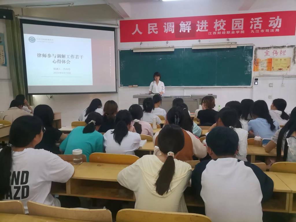 人民調解在法治中國建設中具有重要意義。為落實人民調解“六進”活動,提升人民調解在青年學生中的知曉率,發揮人民調解護航青春的職能,6月15日下午,我校與九江市司法局聯合舉行人民調解進校園活動,邀請九江市訪調對接調解員周盈丹、九江市商業糾紛調解委員會調解員方丹丹講授人民調解工作。