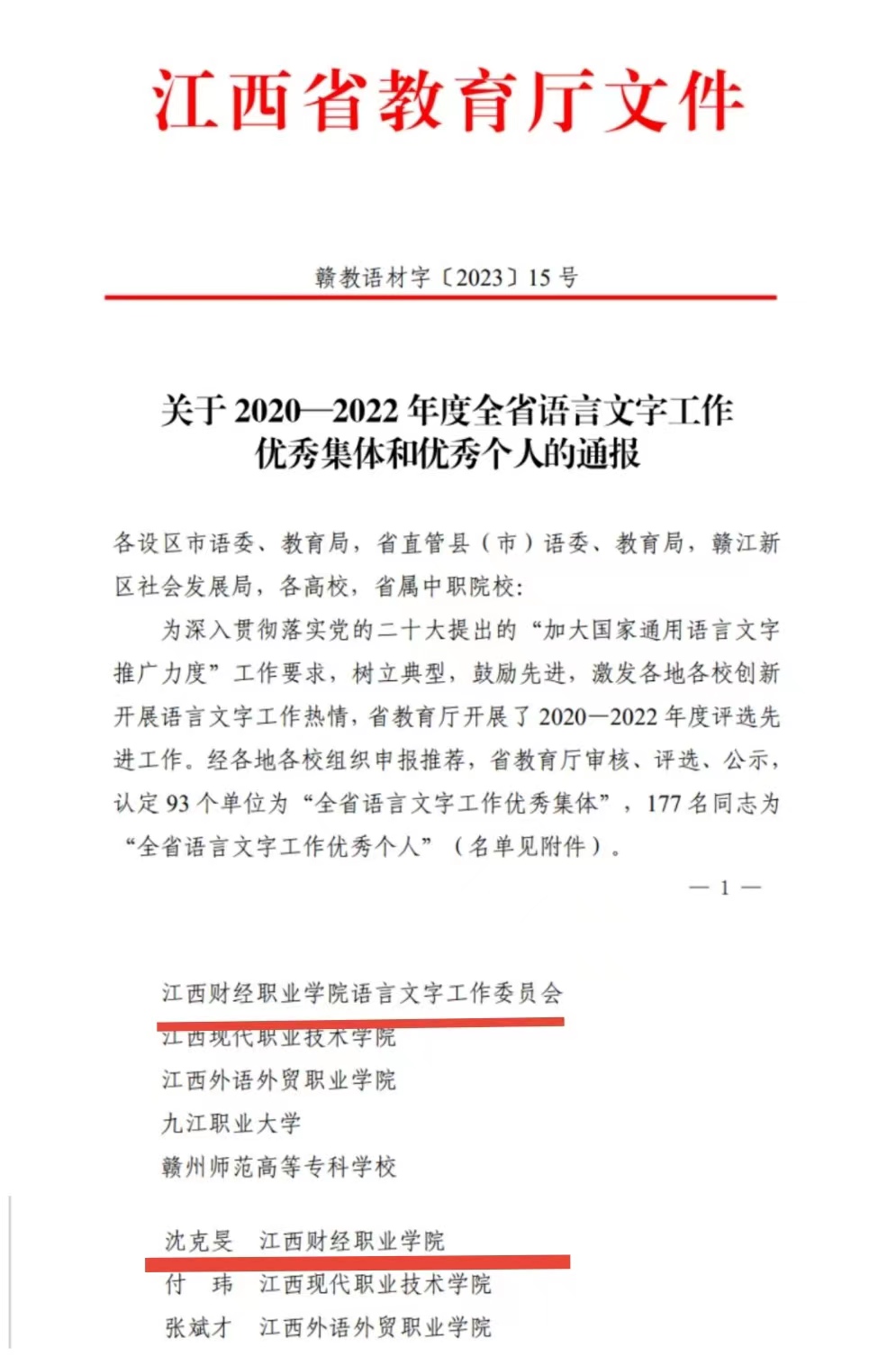 日前,省教育廳發布了《關于2020-2022年度全省語言文字工作優秀集體和優秀個人的通報》(贛教語材字〔2023〕15號),我校榮獲“全省語言文字工作優秀集體”,基礎教育學院教師沈克旻被評為“全省語言文字工作優秀個人”。