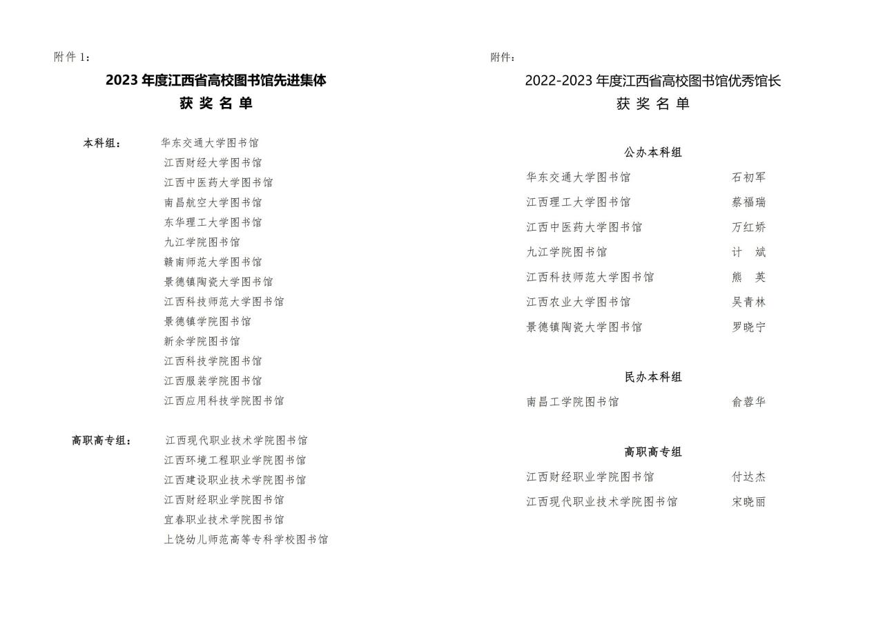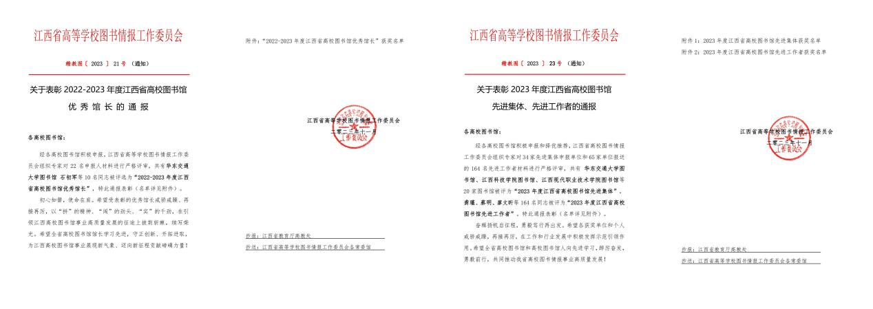 2023年11月8日,江西省高等學校圖書情報工作委員會下發(fā)了《關于表彰2023年度江西省高校圖書館先進集體、先進工作者的通報》(贛教圖〔2023〕23號)和《關于表彰2022-2023年度江西省高校圖書館優(yōu)秀館長的通報》(贛教圖〔2023〕21號)。我校獲評2023年度江西省高校圖書館先進集體,全省僅6所高職高專院校獲此榮譽。我校圖文信息中心主任付達杰同志獲評2022-2023年度江西省高校圖書館優(yōu)秀館長。圖文信息中心丁曉英、李鵬同志榮獲江西省高校圖書館先進工作者榮譽稱號。