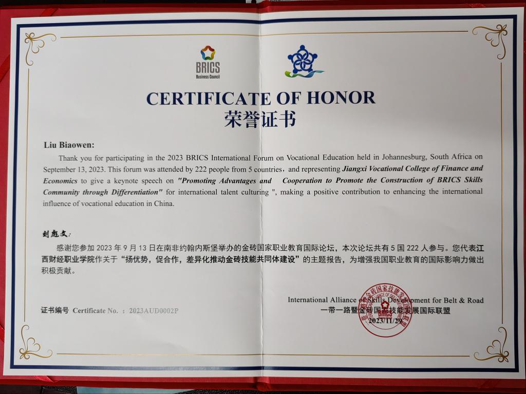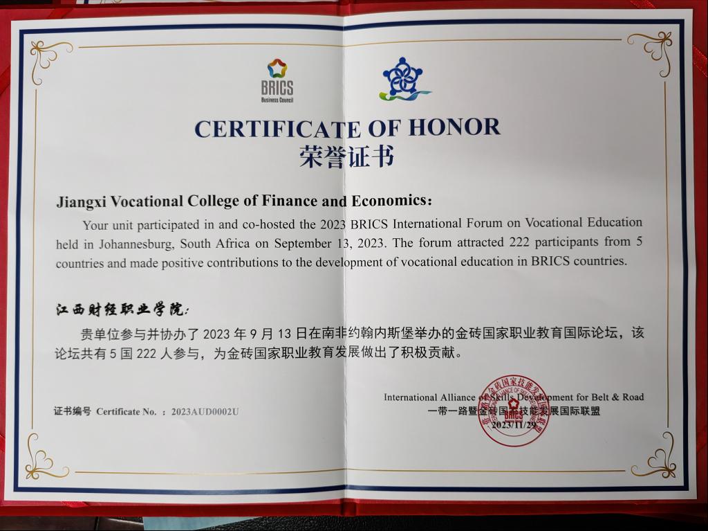 會上,四川財經(jīng)職業(yè)學(xué)院黨委書記張華為大會致辭,她首先對與會嘉賓的到來表示熱烈歡迎。她表示,國際化既是高校邁向世界、走向卓越的必由之路,也是提升高等教育發(fā)展質(zhì)量的重要途徑,希望本次會議能為數(shù)智財經(jīng)高等教育搭建良好平臺,為財會專業(yè)的國際化發(fā)展貢獻更多的力量。會議聽取了“以中國標準引領(lǐng)金磚+教育”“‘機器學(xué)習(xí)與大數(shù)據(jù)’金磚國家國際團體標準建設(shè)經(jīng)驗分享”等報告、委員會2023年工作成果及2024年主要工作安排。會議還匯報了2023年金磚國家(南非)職業(yè)教育論壇開展情況,并對為金磚國家職業(yè)教育發(fā)展事業(yè)作出重大貢獻的單位和個人進行表彰,我校和校黨委書記劉彪文獲此殊榮。