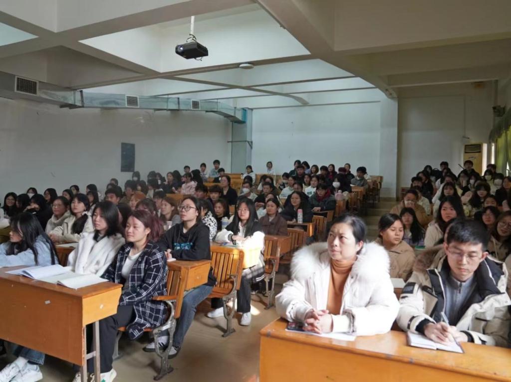 課堂上,彭慧校長分享了優秀校友的創業故事,并鼓勵同學們要深刻理解和領悟“嚴謹、求實、團結、奮進”的校風。在擇業方面,同學們要學會在深入社會、了解行業發展中尋求就業機會;要蓄勢待發、變中突破以走向職業巔峰;要在求職中不忘家國情懷和責任擔當。同時,她勉勵同學們要在新時代大潮中正確地認識自我,找到自己的“坐標”;要認清當前就業形勢,在求職路上志存高遠、腳踏實地;在不懈奮斗中勇于擔當,必能讓個體奮斗與強國宏圖同頻共振。