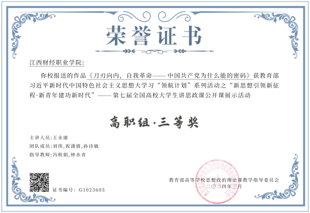 近日,由教育部高校思想政治理論課教學指導委員會主辦,南開大學馬克思主義學院承辦的“新思想引領(lǐng)新征程·新青年建功新時代”——第七屆全國高校大學生講思政課公開課展示活動評審結(jié)果公布,1403所高校報送的4402份作品,共評選出獲獎作品598項。由我校馬克思主義學院教師馮秋娟、鐘水青指導,學生王永康、劉偉、祝瀟倩、孫詩敏主講的參賽作品《刀刃向內(nèi),自我革命——中國共產(chǎn)黨為什么能的密碼》榮獲高職組三等獎。