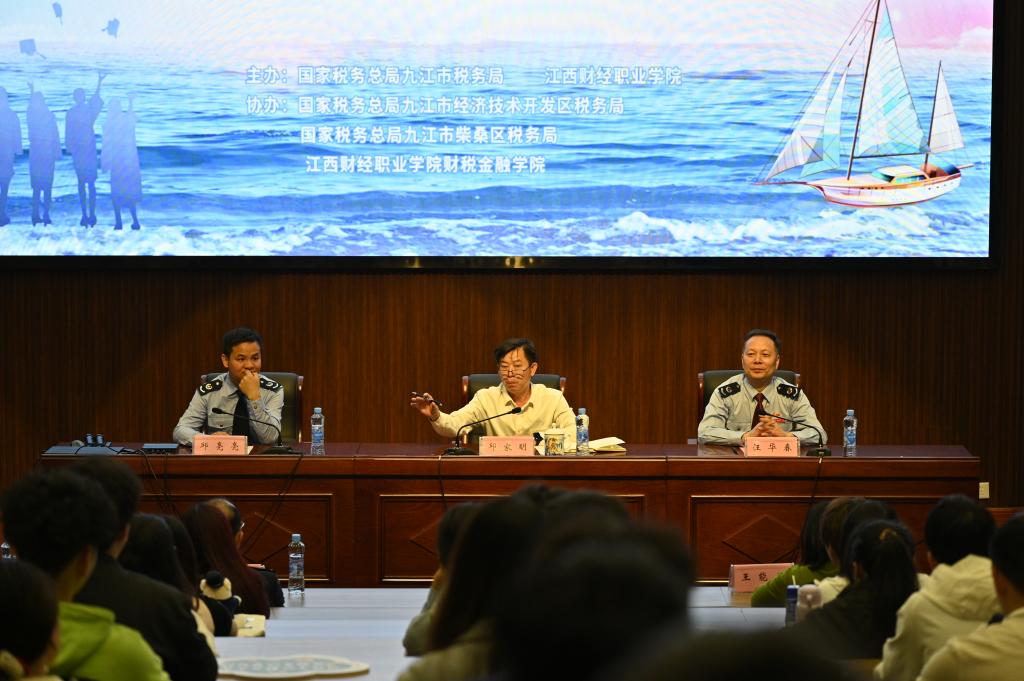隨后,九江市稅務(wù)局黨委委員、總會(huì)計(jì)師汪華春發(fā)表了熱情洋溢的致辭。他首先回憶了自己在江西財(cái)經(jīng)職業(yè)學(xué)院度過的青春時(shí)光,并對(duì)母校的財(cái)稅金融專業(yè)給予了高度評(píng)價(jià)。他表示,稅務(wù)部門與學(xué)校之間有著深厚的友誼和廣泛的合作基礎(chǔ),此次走進(jìn)美麗的新校區(qū)舉辦稅收宣傳月啟動(dòng)儀式暨稅法進(jìn)校園活動(dòng),正是為了進(jìn)一步加強(qiáng)雙方的交流合作,推動(dòng)稅收知識(shí)普及和法治教育。