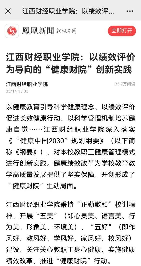 5月14日,鳳凰新聞刊登文章《江西財(cái)經(jīng)職業(yè)學(xué)院:以績(jī)效評(píng)價(jià)為導(dǎo)向的“健康財(cái)院”創(chuàng)新實(shí)踐》。