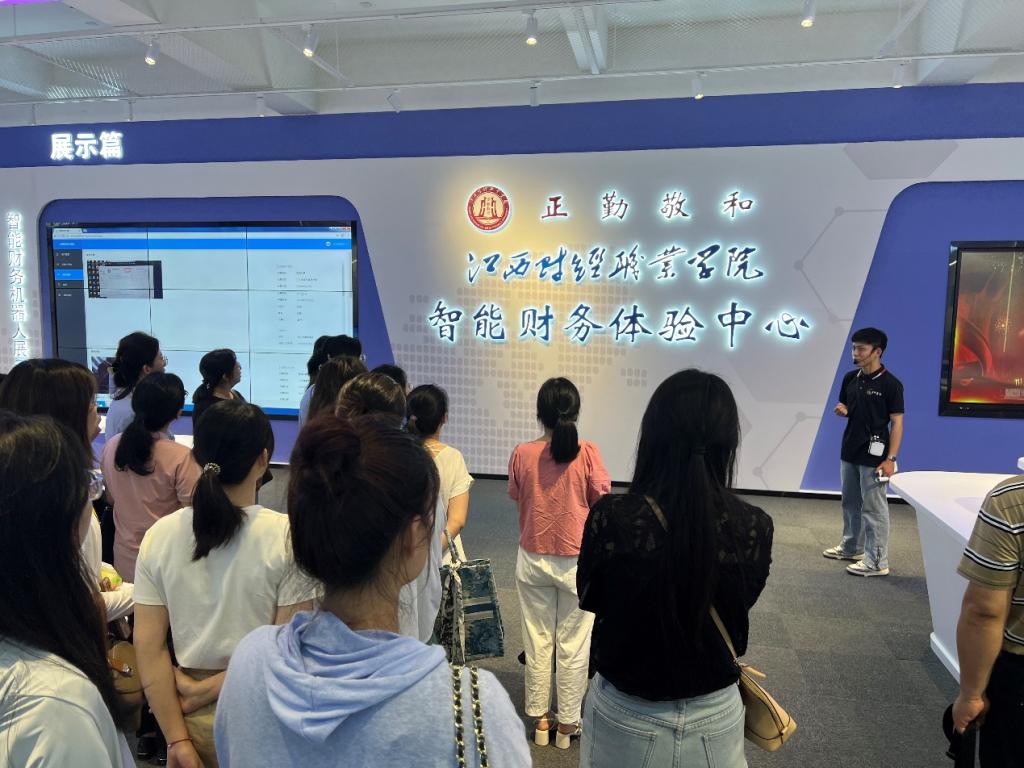“國培”班一行參觀了學校圖書館、教學樓、智能財務體驗中心等場所,文化旅游學院旅游管理專業學生鄭楊櫳、陳綺麗兩位同學為到訪人員詳細介紹了八里湖校區整體設計,建筑布局、校訓內涵等情況。