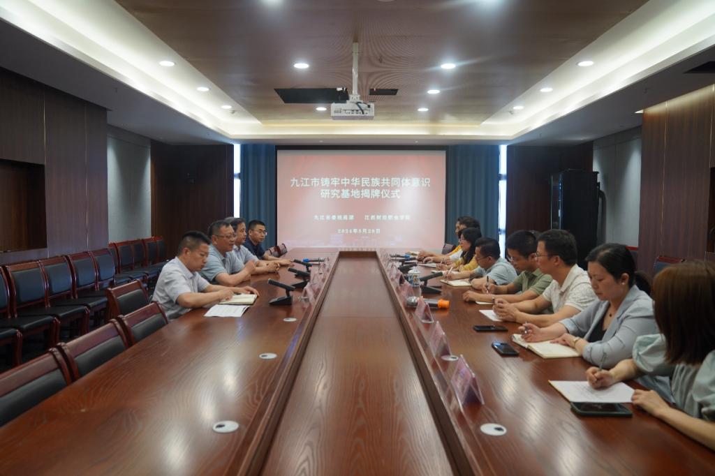 5月28日,九江市鑄牢中華民族共同體意識(shí)研究基地揭牌儀式在我校八里湖校區(qū)行政樓727會(huì)議室舉行。市民族宗教事務(wù)服務(wù)中心主任胡定文、副主任虞功智、民族宗教事務(wù)服務(wù)中心民族科副科長(zhǎng)程清,市委統(tǒng)戰(zhàn)部一級(jí)主任科員黃曉平,我校黨委委員、副校長(zhǎng)邱家明,黨委統(tǒng)戰(zhàn)部、黨委宣傳部、學(xué)生工作處、團(tuán)委、教務(wù)處、馬克思主義學(xué)院、安全保衛(wèi)處等部門(mén)負(fù)責(zé)人參加了揭牌儀式。
