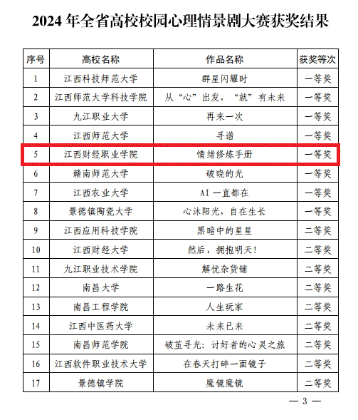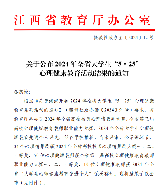 近日,江西省教育廳辦公室印發了《關于公布2024年全省大學生“5·25”心理健康教育活動結果的通知》(贛教社政辦函〔2024〕12號),由我校王美娟、張亦弛、吳菁菁老師指導,張樂、胡著濤、嚴劍晨等二十余名同學的原創劇目《情緒修煉手冊》喜獲2024年江西省高校心理情景劇大賽一等獎。我校大學生心理健康教育中心負責人王美娟獲得2024年江西省大學生“心理健康教育先進個人”榮譽稱號。