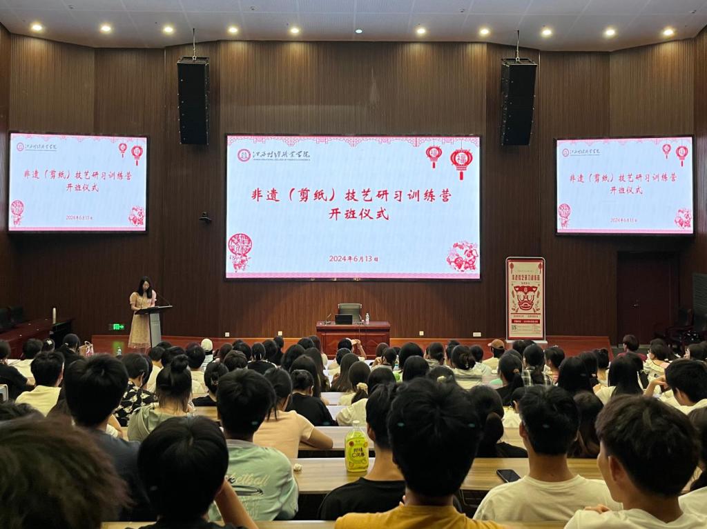 為深入貫徹落實黨的二十大精神,推進文化自信自強,傳承中華優秀傳統文化,促進學生文化素養提升,6月13日下午,第二期非遺(剪紙)技藝研習訓練營在八里湖校區行政樓報告廳順利開班。新學員及學生代表200余人參加,團委徐穎主持。