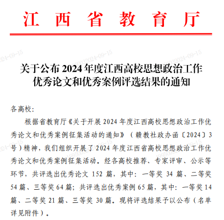 近日,省教育廳公布了2024年度江西高校思想政治工作優(yōu)秀論文和優(yōu)秀案例評選結果。我校選送的3篇論文均榜上有名,榮獲思政優(yōu)秀論文一等獎2項、二等獎1項。
