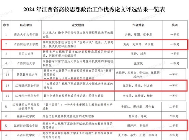 其中,《高職院校思想政治理論課“五環(huán)六式”教法:人培向度、模式機理和應然路徑》(作者:黃亮等)和《“大思政課”視域下思政課問題式專題化教學改革的破與立》(作者:江國鈺等)榮獲一等獎,《新質(zhì)生產(chǎn)力視域下算法推薦賦能思想政治教育發(fā)展的路徑研究》(作者:謝莎莎等)榮獲二等獎。