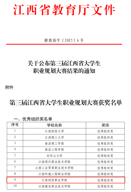 近日,江西省教育廳公布了第三屆江西省大學(xué)生職業(yè)規(guī)劃大賽結(jié)果。我校憑借出色的組織工作榮獲“優(yōu)秀組織獎(jiǎng)”,4名學(xué)生在比賽中表現(xiàn)突出,共斬獲銀獎(jiǎng)1項(xiàng)、銅獎(jiǎng)3項(xiàng),展現(xiàn)了學(xué)校在職業(yè)規(guī)劃教育和人才培養(yǎng)方面的豐碩成果。