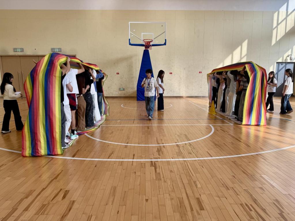 隨后的素質拓展項目環環相扣,將活動氣氛不斷推向高潮。熱身游戲“愛的抱抱”以輕松有趣的方式迅速點燃全場,同學們反應敏捷,默契配合,歡聲笑語中彼此的距離迅速拉近。在“重走長征路”項目中,隊員們需要高度專注、通力協作,通過精準控制地圖,引導網球沿著光輝的革命路線從“瑞金”穩步前行至“延安”。這個過程不僅是對團隊耐心與默契的嚴峻考驗,更讓同學們在“球落重來”的挫折與堅持中,深刻感悟了團結一心、不畏艱險的奮斗精神。