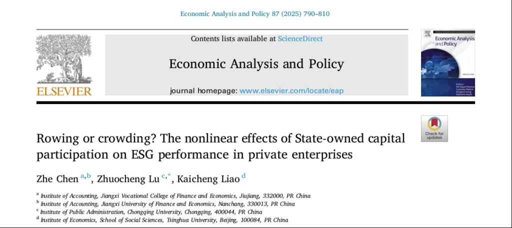 近期,會計學院黨員青年教師陳哲博士作為第一作者的合作論文“Rowing or crowding? The nonlinear effects of State-owned capital participation on ESG performance in private enterprises”被經濟學國際高水平期刊Economic Analysis and Policy接收并正式發表。 Economic Analysis and Policy是JCR一區、中科院二區TOP期刊,在Economics學科類別的排名為11/597,2024年的影響因子為8.7。陳哲博士是該論文的第一作者,且我校是該論文的第一署名單位。