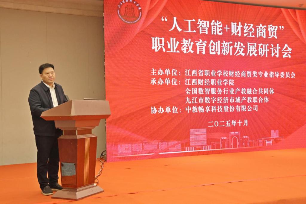 10月22日,江西省職業(yè)學(xué)校財經(jīng)商貿(mào)類專業(yè)指導(dǎo)委員會(以下簡稱“專指委”)2025年工作會議“人工智能+財經(jīng)商貿(mào)”創(chuàng)新發(fā)展研討會在九江順利召開。本次會議由專指委主辦,江西財經(jīng)職業(yè)學(xué)院、數(shù)智服務(wù)行業(yè)產(chǎn)教融合共同體、九江市數(shù)字經(jīng)濟市域產(chǎn)教聯(lián)合體承辦,中教暢享科技股份有限公司協(xié)辦。專指委主任委員、江西省教育考試院黨委書記劉彪文,江西財經(jīng)職業(yè)學(xué)院黨委書記李松志,九江市政府副秘書長方忠生,九江市教育局副局長曹利平,中教暢享科技股份有限公司董事長黃學(xué)全和來自全省60多所職業(yè)學(xué)校的校領(lǐng)導(dǎo)、財經(jīng)商貿(mào)二級學(xué)院院長(主任)、專業(yè)負(fù)責(zé)人和骨干教師150余人參加了此次會議。會議由江西財經(jīng)職業(yè)學(xué)院副校長馮弋江主持。