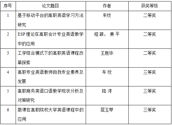 近日江西省外語學會網站公布了2015年優秀論文(著)評選結果,由我校外國語學院教師撰寫的6篇論文分別獲得二、三等獎。這次評選活動吸引了包括全省本科院校在內的所有高校外語教師參加,我校教師的獲獎級別和獲獎論文數在省內高職高專院校中均排名第一。這是繼外國語學院榮獲“2014年度學校科研先進單位”后取得的又一佳績。外國語學院多年來一直非常重視科研工作,注重提高教師的科研能力,以科研促教學成效顯著,教師和學生在各類競賽中都取得了優異成績。