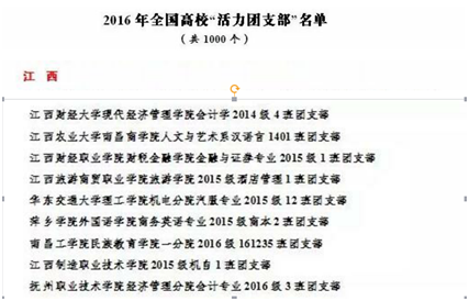 全國高校“活力團支部”創(chuàng)建遴選活動由團中央學(xué)校部舉辦,面向全國各高校(含高職院校、民辦高校、獨立學(xué)院)的學(xué)生團支部(總支),經(jīng)校內(nèi)創(chuàng)建、省級遴選、全國遴選、網(wǎng)絡(luò)公示等環(huán)節(jié),最終產(chǎn)生1000個全國高校“活力團支部”。江西省高校共有37個團支部入選,其中高職院校的團支部有4個。