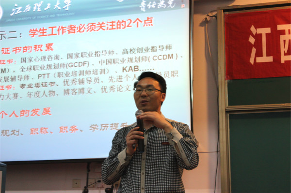 4月21日下午,我校在七樓報告廳舉辦2017年度班主任輔導員培訓第二講,學校邀請到了江西理工大學材料科學與工程學院黨委副書記饒先發為學校全體班主任進行了一場精彩的講座。
