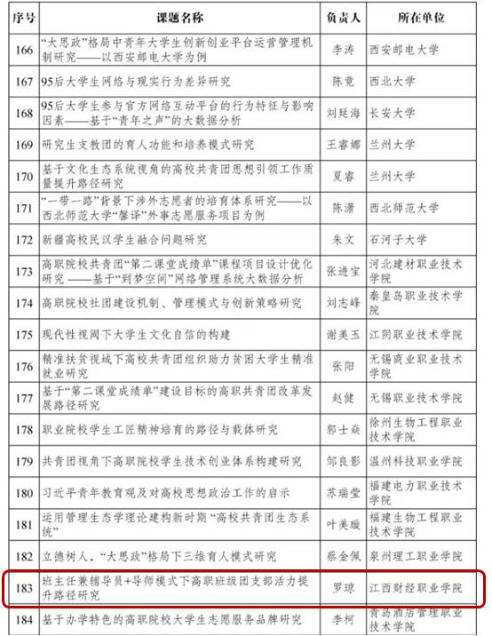 近日,由團中央學校部、全國學聯秘書處組織的2017年度全國學校共青團研究課題評審工作結果揭曉:我校羅瓊老師負責的課題《班主任兼輔導員+導師模式下高職班級團支部活力提升路徑研究》入選重點課題。