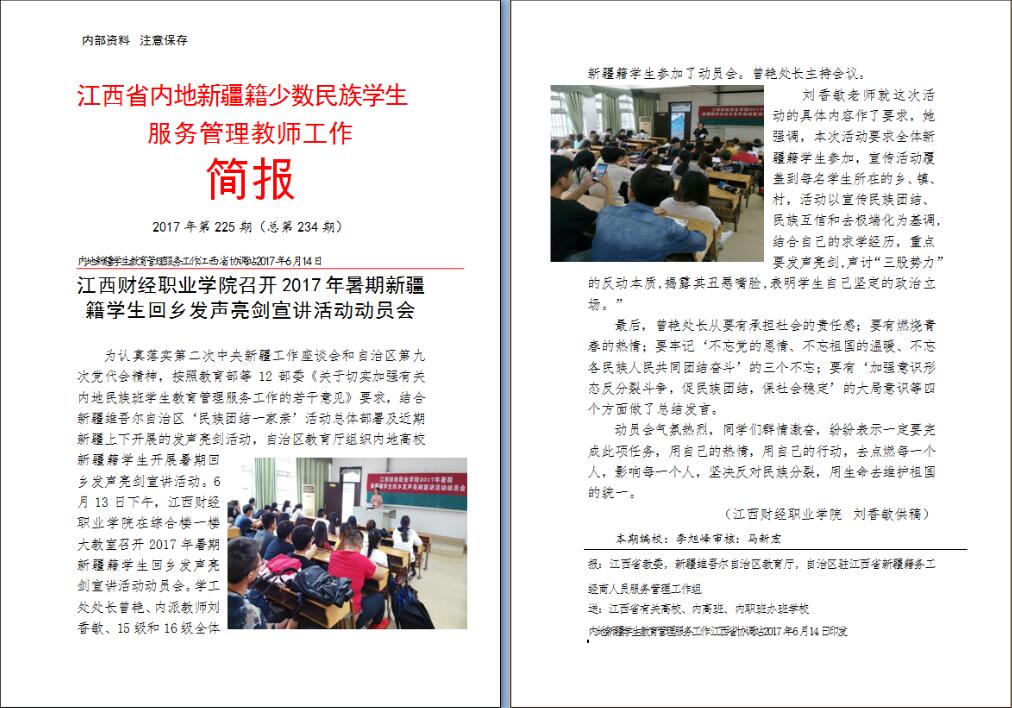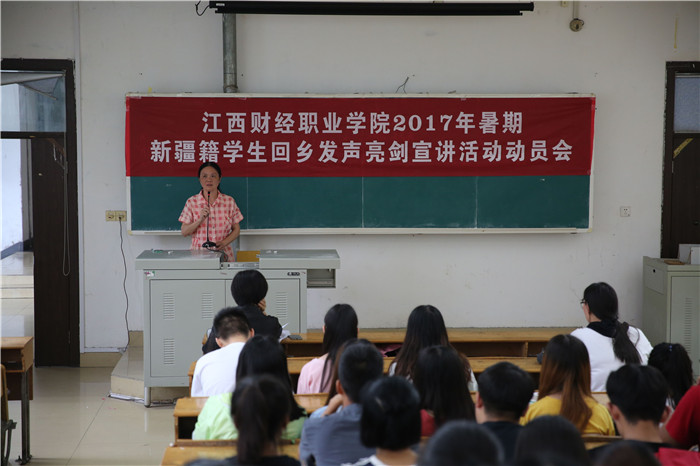 為了認真落實第二次中央新疆工作座談會和自治區第九次黨代會精神,按照教育部等12部委《關于切實加強有關內地民族班學生教育管理服務工作的若干意見》要求,結合新疆維吾爾自治區‘民族團結一家親’活動總體部署及近期全區上下開展的發聲亮劍活動,我校于2017年6月13日在綜合樓階梯一召開了百名新疆籍學生2017年暑期回鄉發聲亮劍宣講活動動員大會。我校學工處處長、新疆內派管理教師劉香敏及我校15級和16級全體新疆籍學生參加了動員大會。