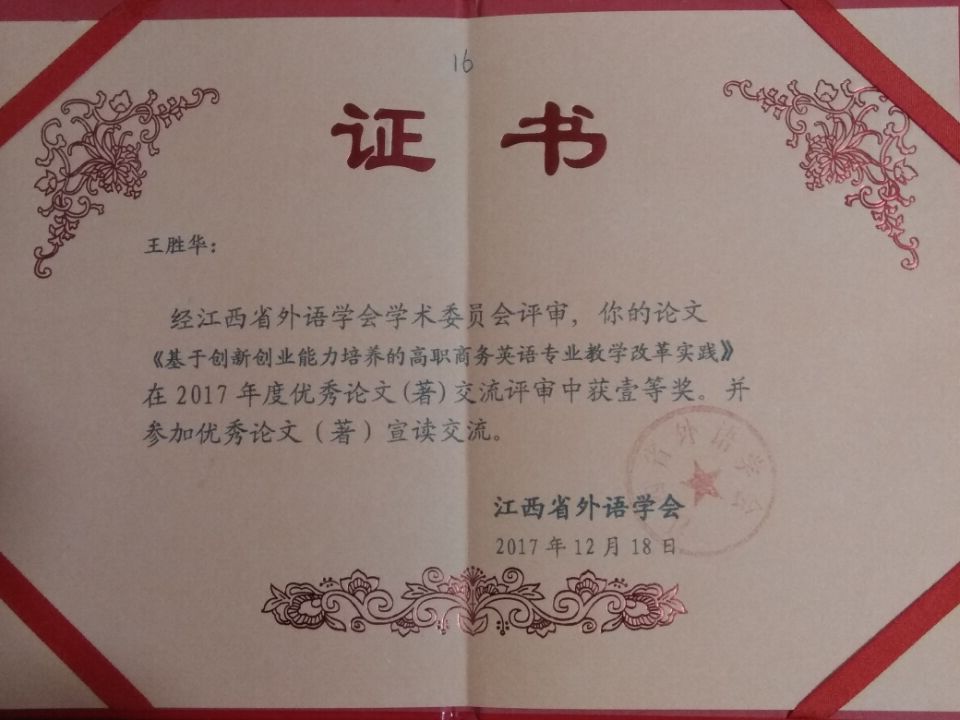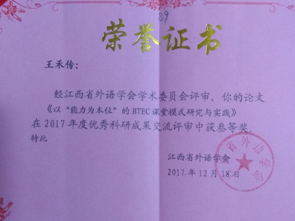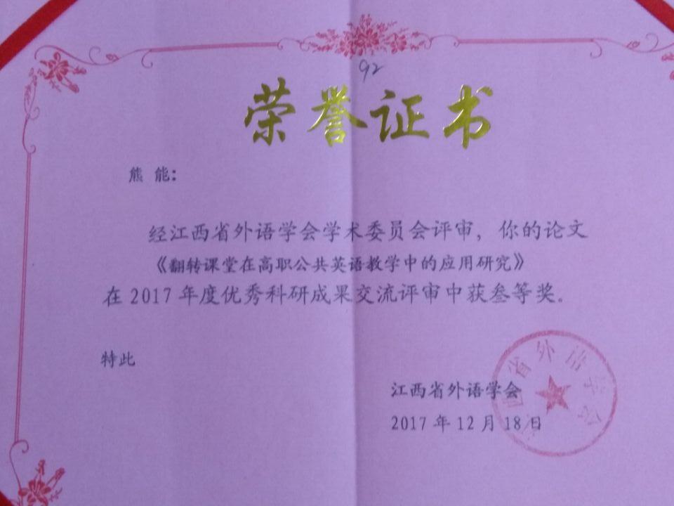 省外語學會會長做學會工作匯報,黨支部書記宣讀了2017年學會優秀論文獲獎名單,并為獲獎人員頒發獲獎證書。論文《基于創新創業能力培養的高職商務英語專業教學改革實踐》獲得一等獎,這是繼去年外國語學院參會論文獲得該論壇一等獎后再次獲此殊榮。論文《以“能力為本位”的BTEC課堂模式研究與實踐》和《翻轉課堂在高職公共英語教學中的應用研究》獲得三等獎。這次獲獎是外國語學院長期重視教育教學研究的成果,進一步提升了外國語學院在江西省外語界的聲譽和影響力。