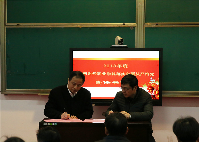為深入貫徹十九大關于全面從嚴治黨總體要求,認真落實中紀委十九屆二次全會、江西省紀委十四屆三次全會精神,強化領導干部全面從嚴治黨責任意識,落實黨風廉政建設“兩個責任”,著力從嚴治黨、從嚴治校,3月22日下午,江西財經職業學院黨委書記林火平與班子成員、中層領導干部分別簽訂了《2018年度落實全面從嚴治黨主體責任書》,黨委副書記、紀委書記曹銳與中層領導干部分別簽訂了《2018年度落實全面從嚴治黨監督責任書》。