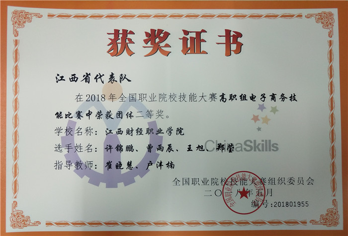5月11日,由教育部、天津市人民政府等35家單位共同主辦的“2018全國職業院校技能大賽”高職組“電子商務技能”賽項在天津商務職業學院開賽,來自全國30個省市的86支代表隊參與角逐。我校派出經濟貿易學院16級電子商務專業許錦鵬、曾雨辰、王旭、鄭瑩四位同學組成的代表隊代表江西省參加競賽。經過一天緊張激烈的角逐,我校代表隊成績排名15(我校在此賽項中歷年最好名次),榮獲大賽團體二等獎。這是我校在此賽項連續第四年獲獎,再一次為學校爭得了榮譽。