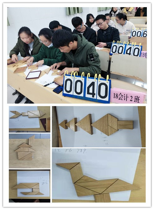 決賽于12月5日下午四點半在教學樓617教室舉行,基礎部領導和數學老師擔任評委。決賽在復賽的基礎上增加“禮尚往來”環節,共四個環節。在“心靈手巧”環節中有五支參賽隊都在規定的三分鐘時間內,利用手中的三盒七巧板拼出三個生動的實物:有小魚、圣誕樹、臺燈、房屋、鴕鳥、手掌等等,均獲得三十分滿分,充分展示了參賽選手的不凡的想象力和創造力。在選手們大顯神通的同時,主持人還為現場觀眾準備了趣味數學題,每一位答對的觀眾均可領取一份小紀念品,現場氣氛頓時熱鬧起來。“禮尚往來”環節和“最后一搏”環節與前兩個環節規則不同,答錯或不答都將扣去相應分值,各隊在未知對手給自己選多少分值題目的情況下面臨一場博弈,根據場上得分情況和自身實力一方面精心為對手選題,另一方面謹慎回答對手為自己選擇的題,斗智斗勇,使得比分拉開距離,比賽緊張而激烈。經過一個多小時的角逐,最終決出一、二、三等獎。