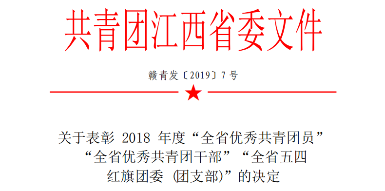 近日,共青團江西省委員會印發《關于表彰 2018 年度“全省優秀共青團員”“全省優秀共青團干部”“全省五四紅旗團委 (團支部)”的決定》,我校財稅金融學院17級金融管理1班團支部榮獲全省“五四紅旗團支部”榮譽稱號。