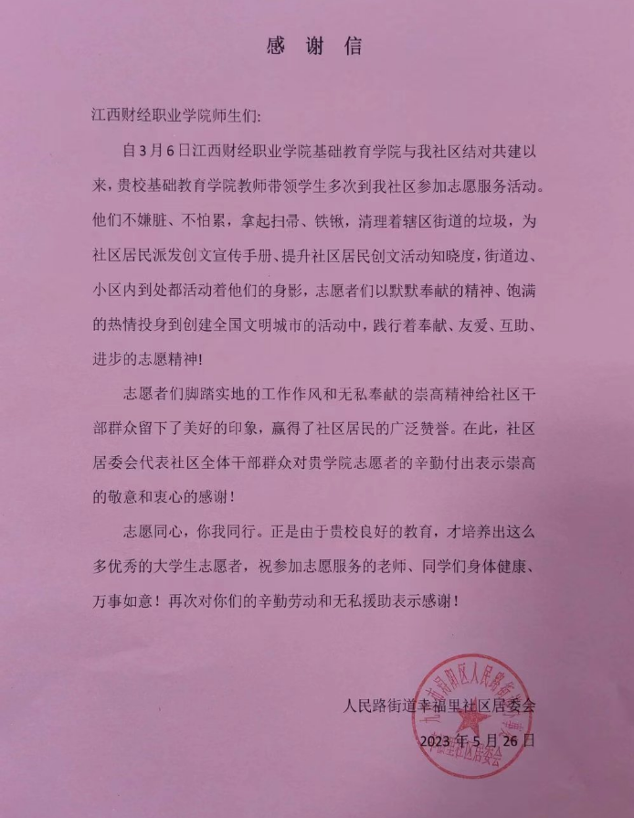 5月26日,基礎教育學院志愿服務隊收到來自結對共建人民路街道幸福里社區的一封感謝信,對基礎教育學院青年志愿者積極服務社區工作表示感謝,對志愿者的服務精神及認真負責的工作態度給予了高度贊揚。