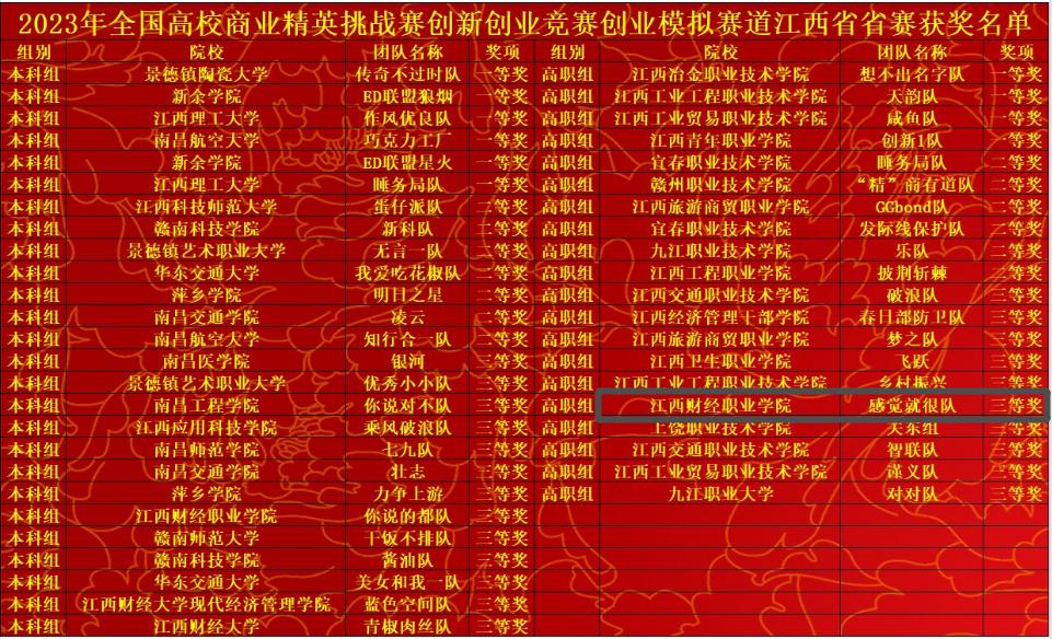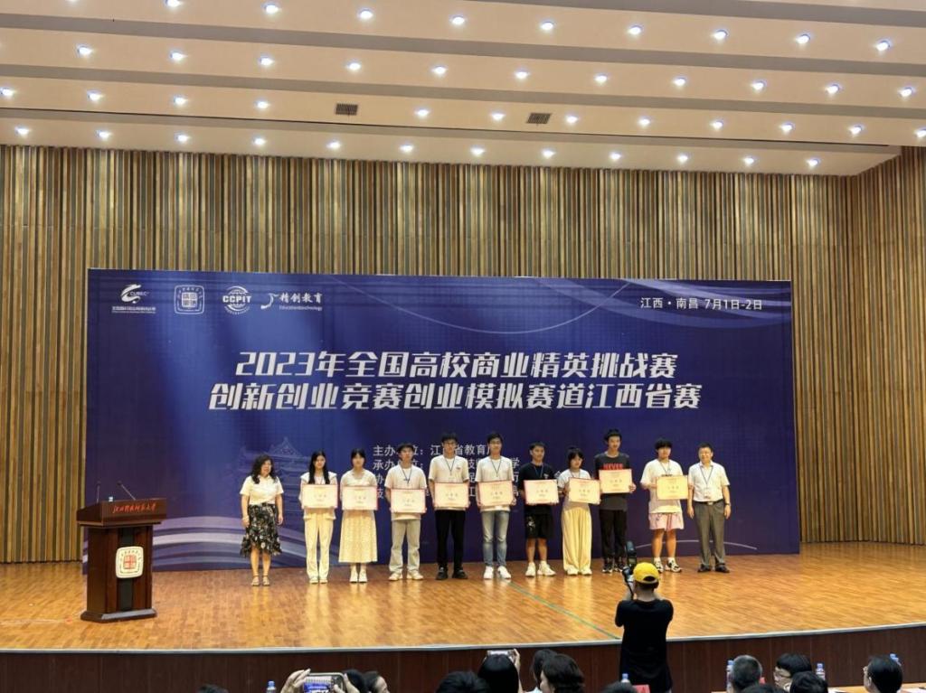 2023年全國高校商業精英挑戰賽創新創業競賽創業模擬賽道江西省省賽(高職組)于7月2日在南昌舉行。由工商管理學院曹玉敏老師、袁晨釗老師指導的饒賽蓮、黃錦玲團隊獲團體三等獎。