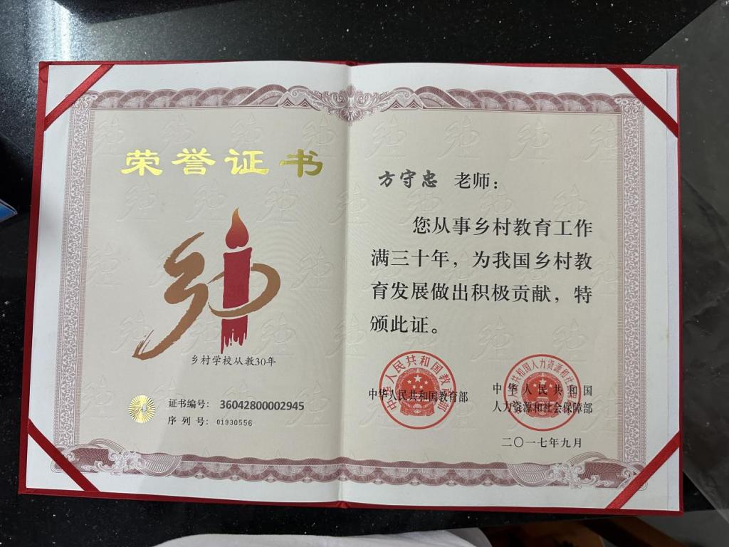 “我所做的都是些平凡的事情,要說比較自豪的是這么多年過去了,無論當年成績好的還是成績差的學生也都還記得我”。退役后,方守忠先在江西共產主義勞動大學工作,后聽從組織安排,返回家鄉,在江西省九江市都昌縣三汊港鎮亮星村小學任教。鄉村小學,最大的困難就是師資匱乏,為此,方守忠一人就擔著三個年級的教學任務,常常是這節課剛給一年級上完,下節課立馬接著給三年級上,學校里連軸轉。成家后,方守忠為了添補家用,下課后還得立馬趕到地里干農活,變成了學校里家里一起連軸轉。就這樣忙忙碌碌,勤勤懇懇,方守忠“一支粉筆、兩袖清風、三尺講臺、四季耕耘”,在鄉村教師的崗位上一干就是37年。37年來,他為一批又一批孩子鋪好了走出山村的路,改變了無數人的命運。