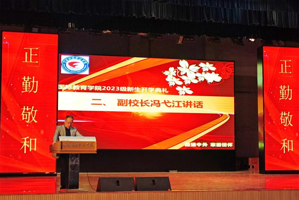 10月10日上午,國際教育學院2023級新生開學典禮在英才交流中心隆重舉行。校黨委委員、副校長馮弋江教授出席典禮,國際教育學院黨政負責人、外籍教師Dallas和各教研室主任、新生班主任及2023級全體同學參加了典禮。開學典禮由黨政辦公室主任王禾傳主持。