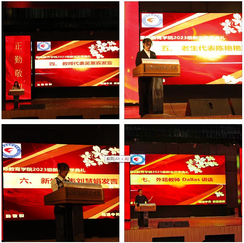 教師代表商務(wù)英語教研室主任吳蕙霖老師致新生寄語,期望新生學好專業(yè)知識,塑造人格品質(zhì),提升綜合技能,培養(yǎng)全球視野,成為具有國際競爭力的商務(wù)英語精英。來自加拿大的外籍教師Dallas分享了自己學習英語的經(jīng)歷,鼓勵同學們積極地學習語言,引導(dǎo)大家快樂地適應(yīng)大學生活,勇于挑戰(zhàn)自己。21級商務(wù)英語2班陳艷艷代表老生發(fā)言,她分享自己的大學生活經(jīng)歷和感受,建議新生們規(guī)劃自己的道路,積極參與各種活動,提高綜合實踐能力。23級商務(wù)英語3班劉慧娟代表新生發(fā)言,她表達了對大學生活的熱切期盼,希望和大家一起努力,勇敢地去追求自己所熱愛的東西,在奮斗中進步。