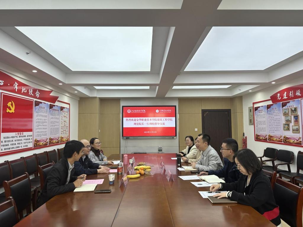 11月23日下午,金華職業技術學院建筑工程學院院長周宏、建筑工程學院工程造價專業副主任劉國平、建筑工程學院工程造價專業教師吳育萍一行來我校調研交專業建設相關工作。城鄉建設學院副院長呂亨龍熱情接待了周宏一行,雙方在綜合樓918會議室進行了座談交流。城鄉建設學院副院長張樂、工程管理教研室主任吳翠翠、建筑工程技術教研室主任郭發麗,骨干教師張麗雅等參加了交流座談。