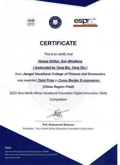 近日,“2023首屆中北非國際職業教育數字化創新技能競賽”跨境電子商務比賽在義烏工商職業技術學院成功舉辦,來自全國各職業院校的近350支隊伍參加了該比賽。由我校國際教育學院楊瑞、楊蓓兩位老師指導的21商務英語4班黃詩凡、淦明鳳獲得全國決賽三等獎。