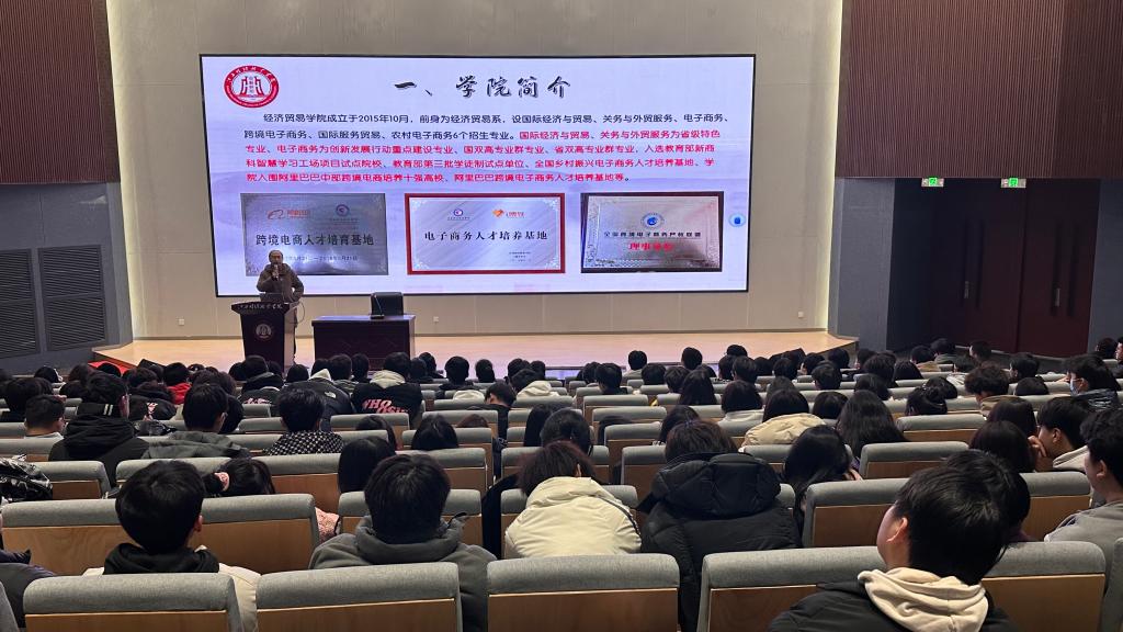 下午在行政樓一樓報(bào)告廳,肖細(xì)根院長(zhǎng)從學(xué)校簡(jiǎn)介、歲月長(zhǎng)河、校園文化、教育教學(xué)、校友風(fēng)采5個(gè)方面為同學(xué)們做校情、校園文化分享,崔曉慧副院長(zhǎng)、電商教研室主任戶灃楠、黨政辦主任杜波分別介紹了經(jīng)貿(mào)學(xué)院院情、成果及文化特色;專業(yè)概況、就業(yè)前景;學(xué)生工作等。陳瀅泓等學(xué)生代表介紹了學(xué)院社團(tuán)特色、文化等。